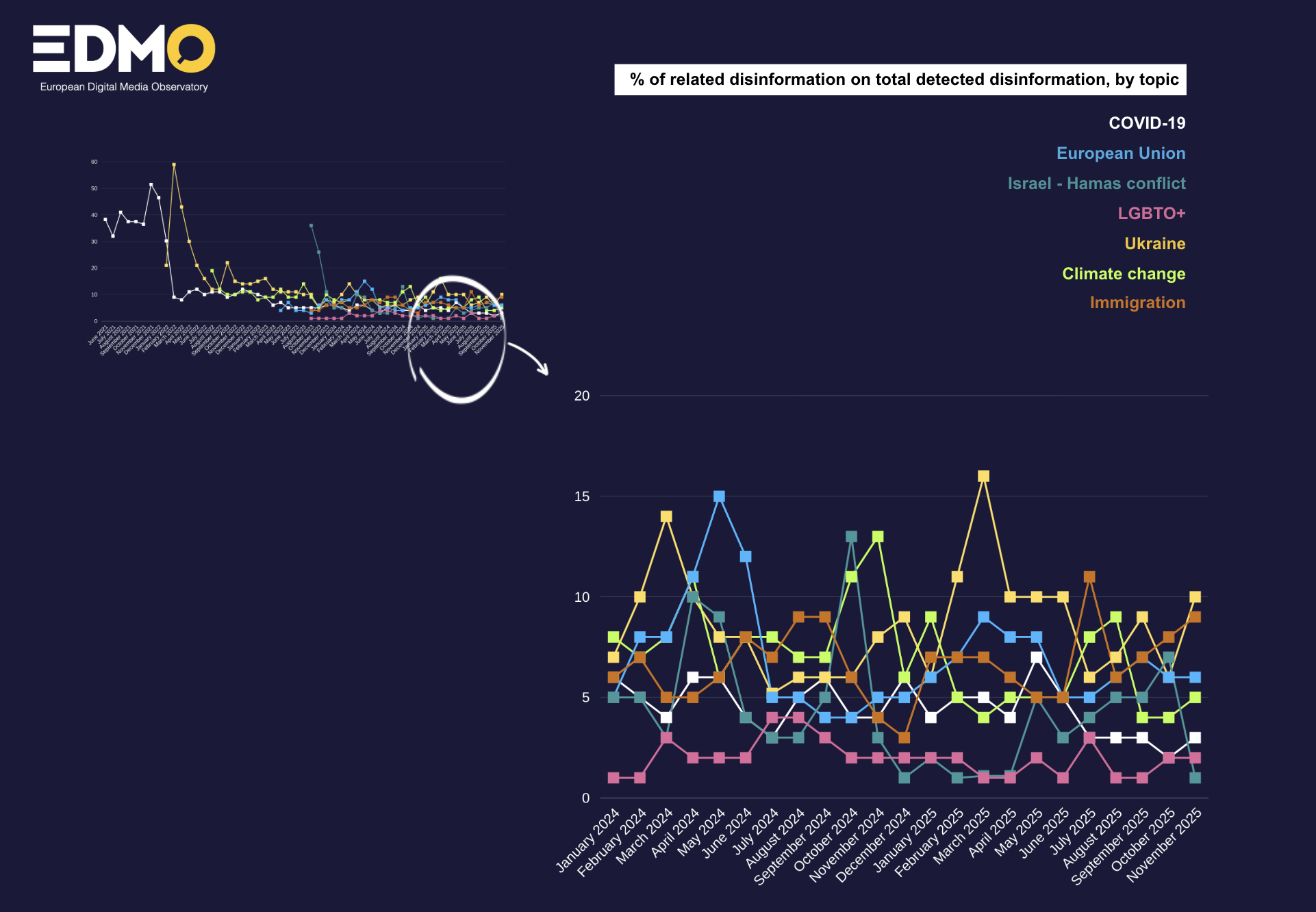 In November 2025, the EDMO fact-checking network published 1,486 articles, with 10% focused on Ukraine-related disinformation and 9% on immigration-related disinformation. Disinformation on the Ukraine war increased due to heightened media attention, particularly depicting Ukraine’s military as weak and disseminating AI-generated false videos of Ukrainian troops surrendering. Claims against Ukrainian leadership, including accusations of President Zelensky’s corruption, also intensified amid real corruption reports.