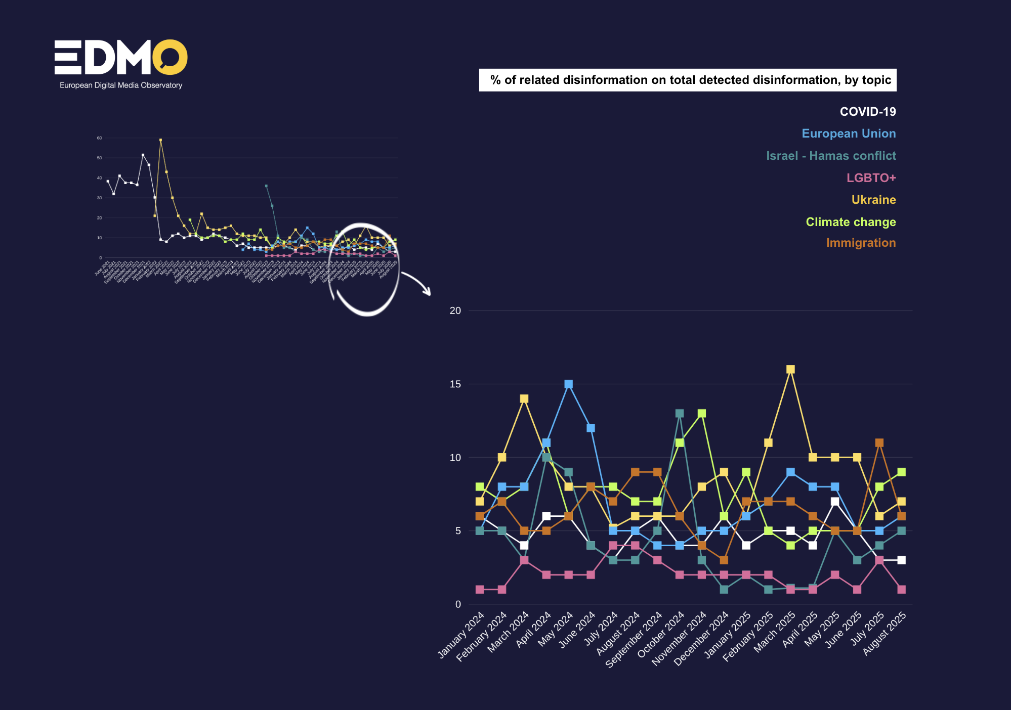 In August 2025, the EDMO fact-checking network published 1,441 articles, with 127 (9%) targeting climate change disinformation, 99 (7%) on Ukraine, 90 (6%) each on EU and immigration issues, and 79 (5%) on the Israel-Hamas conflict. Disinformation around climate change led the focus, reflecting a rising trend. Claims about the Ukraine war and EU narratives also surged, including exaggerated portrayals of Europe’s militarization and misinformation about military actions.